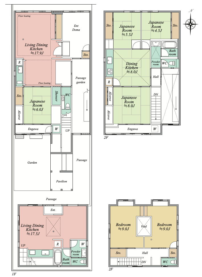The main house features a 3-bedroom (3LDK) layout, while the annex offers a 2-bedroom (2LDK) with high ceilings that create a more open feel. Notable features include an underfloor-heated earthen LDK, an inner garden, and a traditional tori-niwa passage.