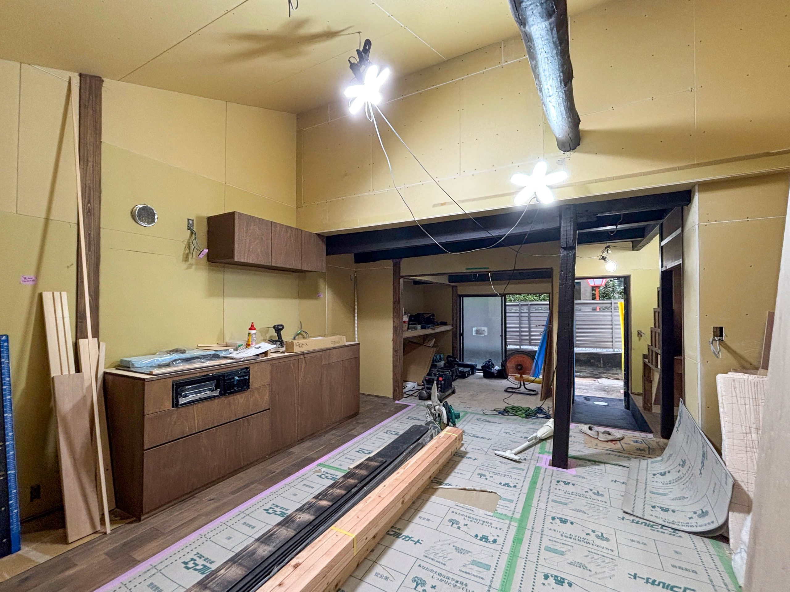 The initial stages of the Kitano Tenmangu Machiya renovation have officially begun, with work focused on carefully dismantling the interior. While not a full demolition, this step involves the removal of non-structural elements, outdated materials, and damaged sections to prepare the space for restoration.